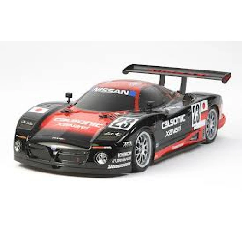 Nissan R390 GT1Â Type E chassis is een 4 wd aangedreven elektro auto in schaal 1/10 van Tamiya, deze wordt geleverd incl. Elektronische snelheids regelaar, lexaan body parts, en heeft onafhankelijk geveerde wielophanging en RS 540 motor